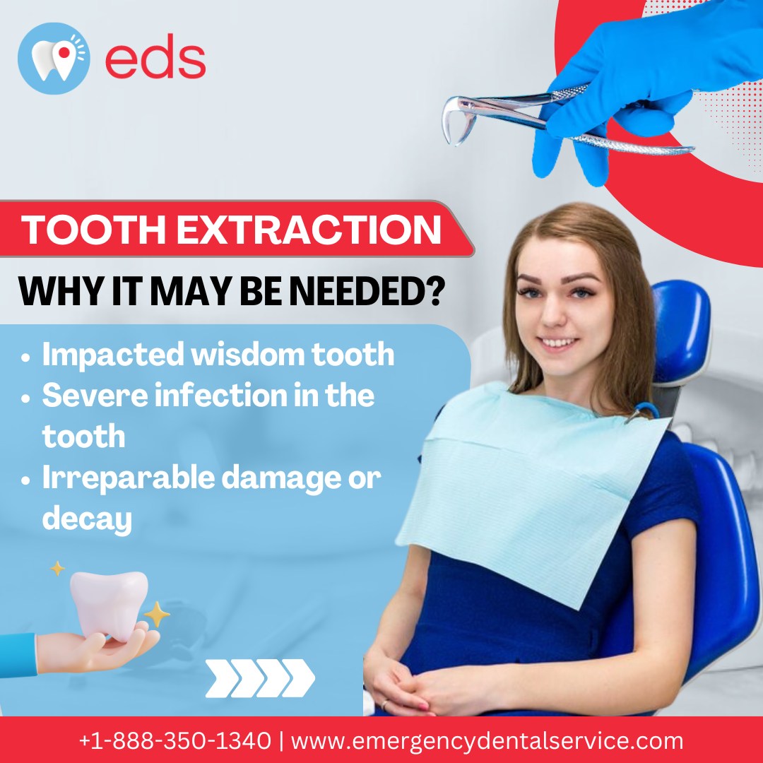 Tooth extraction is a dental procedure that is necessary due to various factors, such as impacted wisdom teeth, severe infections, or irreparable damage. It involves the careful removal of a tooth from its socket in the jawbone. Emergency Dental Service offers quick tooth extraction solutions to relieve pain and restore your comfort and smile. To schedule an appointment with 24 Hour Dentist call us at 1-888-350-1340.